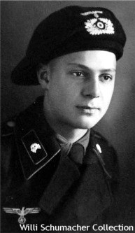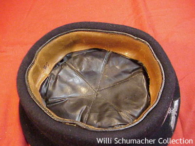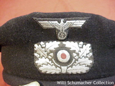 By order HV 43B, No. 352 dated 11 June 1943, a new cap for the Panzertruppen was introduced. This was the M1943 field cap in black wool with one piece woven insignia on a black trapezoid backing. This cap replaced the service caps (sometimes with the wire removed and referred to as "crushers"), old-style field caps, or service caps with the standard gray-green covers, which some officers and NCOs continued to wear regardless of orders. The black panzer M1943 field cap was made to the same specifications as the gray-green model, the only difference being the color. Officer caps were piped in silver aluminum wire piping and general officers in gilt aluminum wire piping. Officers and generals typically wore the insignia executed in silver or gilt aluminum wire thread respectively. Also the two pebbled metal buttons on the front of the cap were silver for officers and gold for generals. The buttons were usually painted black for NCOs and other ranks. The long bill on this model cap was disadvantageous in tank operations when sighting the guns, etc. and was often worn backwards.