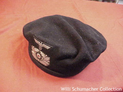 This headgear consisted of the soft padded crash helmet, which served to protect the heads of the panzer crew from injuries sustained when the vehicle was motoring over rough terrain, and the black cover. The helmet was circular in shape and manufactured with 1.5cm thick felt or red rubber sponge. The exterior was covered in black cloth and the interior was covered in black oilcloth and a leather sweatband. Additionally there was a 3.5cm cloth covered rubber sponge around the circumference of the helmet with a groove to hold the elastic band of the cover in place. There were six ventilation holes in a circular pattern and one center hole. The cover was an oversized black wool beret with an elastic band to hold it in place on the helmet. The cover contained the insignia on the front. Early insignia included a woven wreath with a stamped metal cockade and no national emblem. By order HV 35, No. 646, dated 30 October 1935, a standard had been established for the wearing of insignia on the black panzer beret. It consisted of a woven wreath and cockade using white cotton, later changed to silver-gray, on a black backing. The national emblem was also woven with white cotton, later changed to silver-gray, or aluminum wire for officers, on a black backing. By order HM 41, No. 64, dated 15 January 1941, the black panzer beret was abolished and replaced, however, it was maintained for crews of the Panzer type 38(t), of Czech manufacture, for drivers and co-drivers of armored personnel carriers, and according to order HM 41, No. 277 dated 7 March 1941, for drivers and co-drivers of armored tractors of the type Sd.Kfz.251. Although out of production in 1941, it continued to be worn after this date.