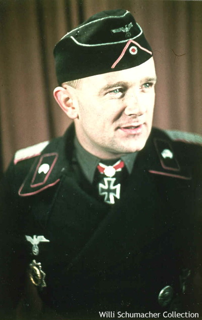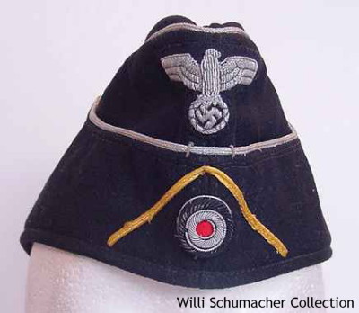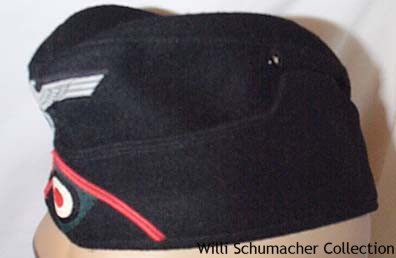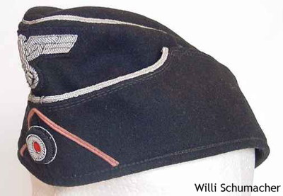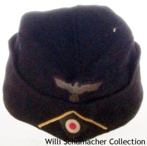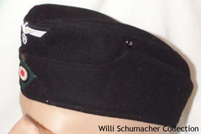 By order HM 40, No. 429, dated 27 March 1940, two new field caps for panzer troops were introduced, the gray-green field caps being expressly forbidden to be worn by panzer crews in their black panzer uniforms. For NCOs and other ranks was a black wool cap in the same style as the M1934 field cap and for officers one in the style of the M1938. Enlisted men were also issued black panzer field caps in the M1942 style, however, the vast majority were in the M1934 style. The M1934 styled cap had a center seam which opened the top of the cap to resemble an M1943 field cap without a visor. It was not permitted to tack the two sides of the top together. The cap tapered down on the back. The turn up was designed to be pulled down over the ears during cold weather. The top front had a tendency to billow out above the front of the turn up. There were two metal grommet ventilation holes, one on each side. The officers wore the M1938 model field cap which had only minor differences from that of the M1934, the primary being the cap didn't open up on the top. Officers wore aluminum wire piping around the crown of the cap and along the top edge of the scalloped front of the turn up. General officers wore gilt aluminum wire piping. Insignia for NCOs and other ranks consisted of a woven national emblem using white thread (later changed to silver-gray) on black backing. Both officers and enlisted wore the cockade in woven tri-color thread (the white being changed later to silver-gray) on a black diamond backing. Some officers preferred the cockade manufactured in aluminum wire or silver bullion. Officer's national emblems were woven in aluminum wire and general's in gilt aluminum wire. Officers and generals had the option of wearing all bullion insignia; officers in silver and generals in gold. Soutaches, piping material formed in an inverted "V", in pink were generally worn over the cockade, however, other colors, such as golden-yellow for panzer reconnaissanceI 1I.The 24. Panzer Division, who commemorated the fact that they used to be the 1. Kavallerie Division and the only one to convert to a panzer division also wore the distinctive golden-yellow piping on their cap soutache, around their tunic collars and around their Totenkopf collar tabs., lemon-yellow for panzer signals, and alternating black and white (black and silver for officers) for Panzer Pioniere companies.
