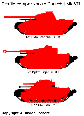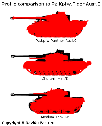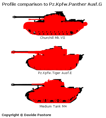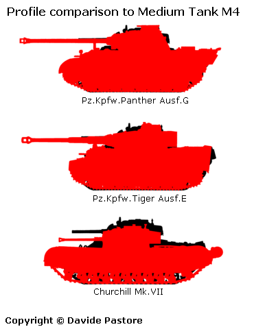 These charts, designed by David Pastore, illustrate the difference in profile between the Panther, Tiger I, Churchill Mk VII, and Medium Tank, M4.